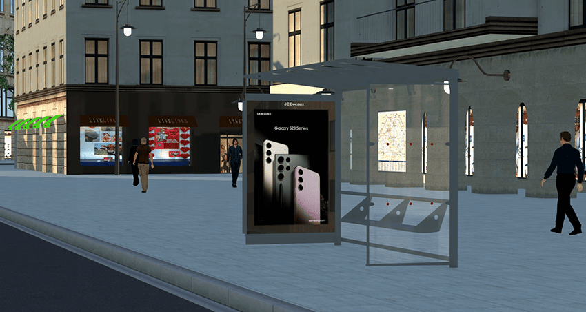 Evalúa la legibilidad de la creatividad a diferentes distancias del soporte y en condiciones de visibilidad diversas. Previsualiza la campaña en un entorno urbano en 3D, lo que permite ponerse en el lugar de la audiencia